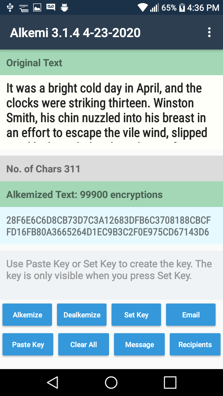 Alkemizes (encrypts) original text; dealkemizes (decrypts) Alkemized text; and lets you easily email and messsge the Alkemized text.