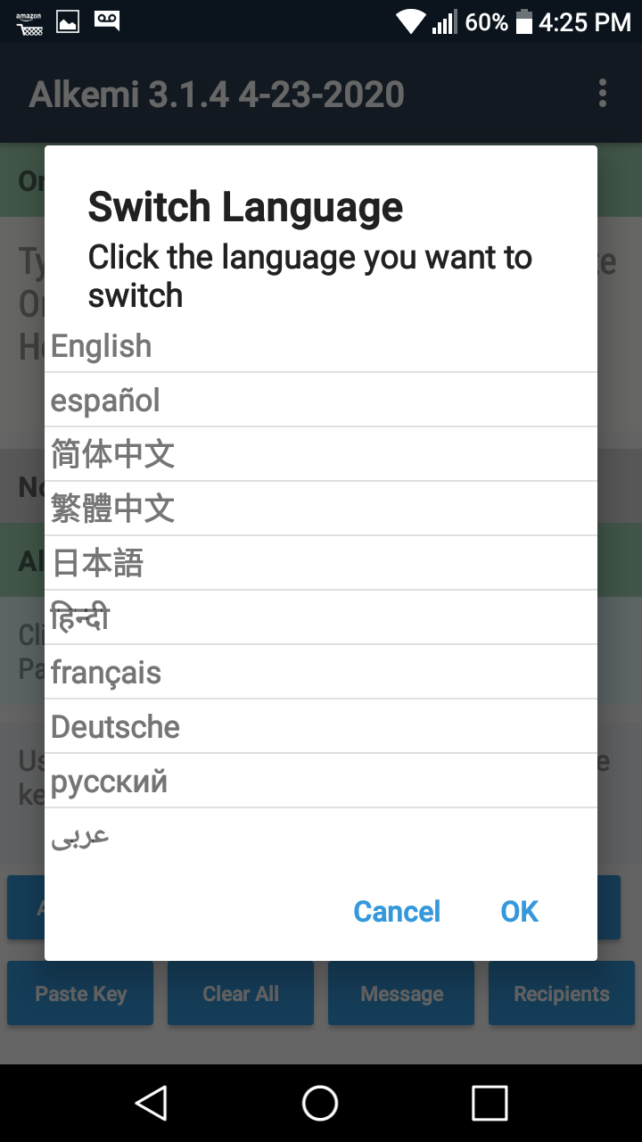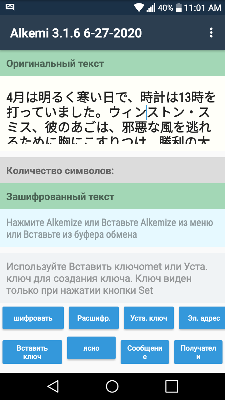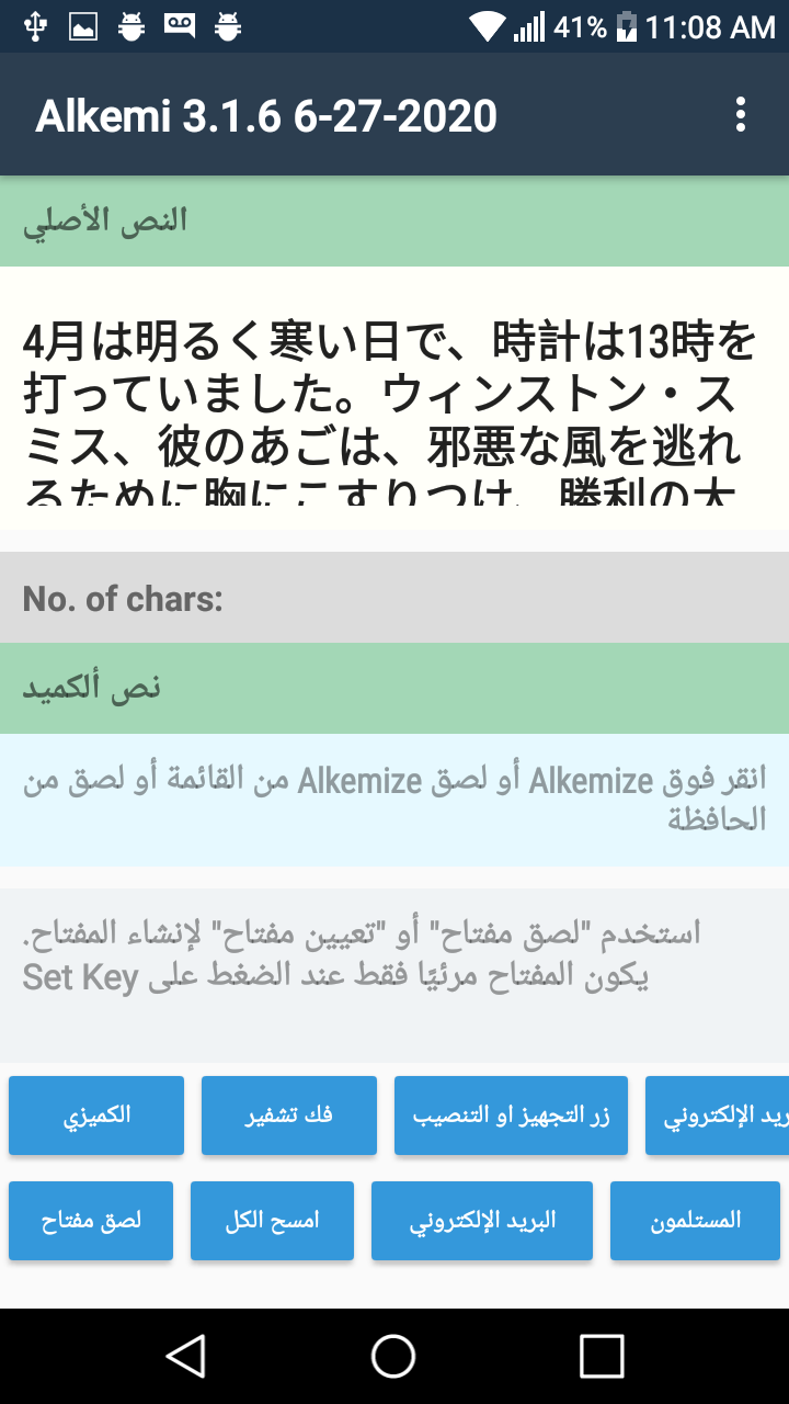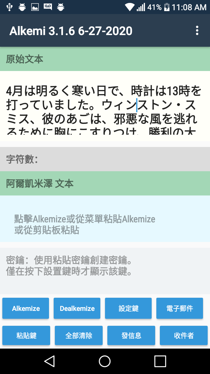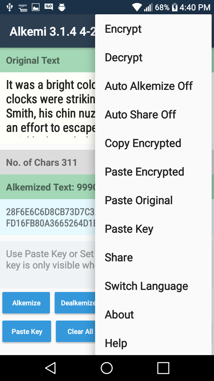 Exactly the same as with Alkemi for Windows, there are three basic functions with Alkemi: Alkemize Original text, deAlkemize, and set the key.