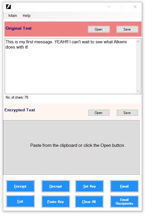 The Encrypted (i.e., Alkemized) data is automatically copied to your clipboard (so is the DeAlkemized data) so in one step you can click the Encrypt button and then paste the encrypted data into your communication program, like this: