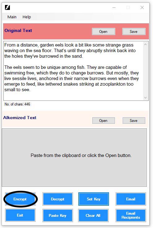 - Click the Encrypt (or Alkemize) button. Alkemi will take your text, and, using your key, will output encrypted text in a special format, which is also just text.
