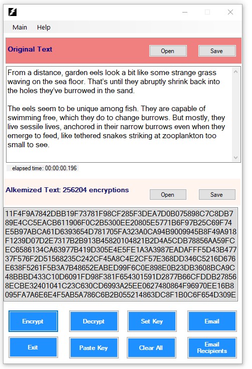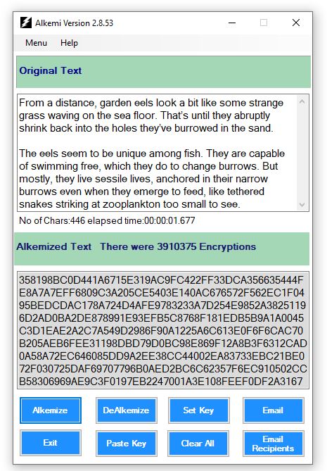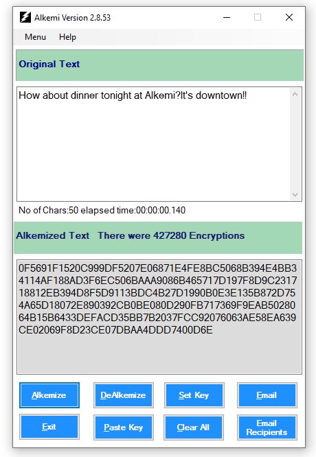 That, my friend, is your alkemized data. The original text is converted into a series of encrypted hex ascii data. And being just text it can easily be sent by text messaging, Messenger, Twitter, email or really any system in which you can send and receive text. You can print it out and mail it. You can even fax it. Now that’s old school!