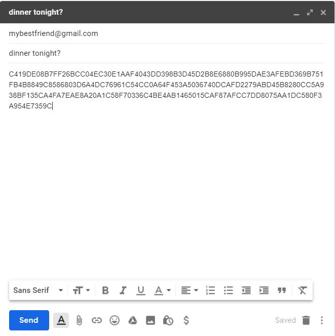 Say I want to email my friend about having dinner tonight. I put my email message in the Original Text box. My friend and I already share a key. I click the Encrypt (or Alkemize) button and get this: