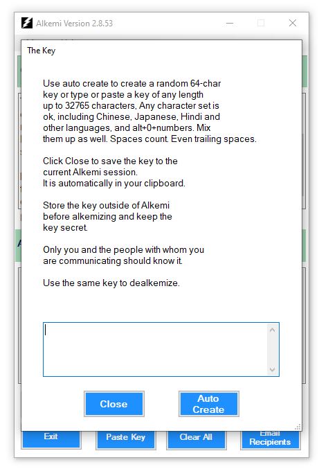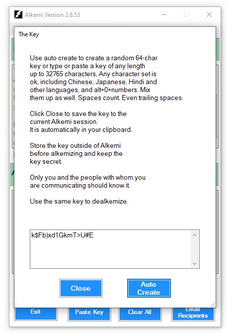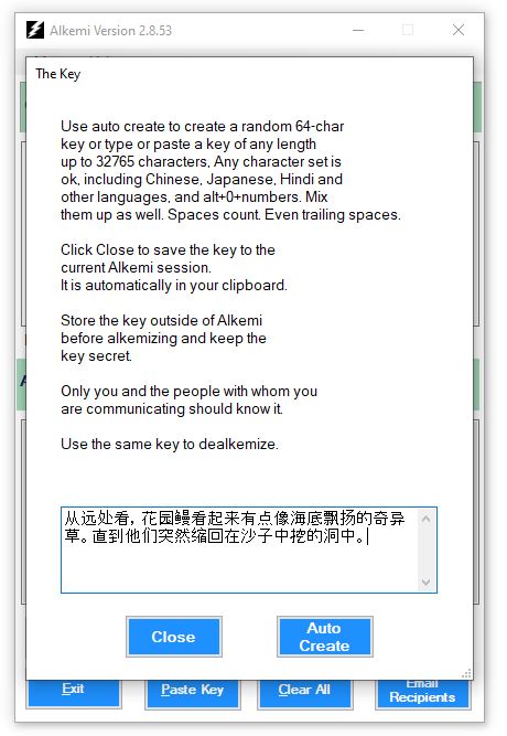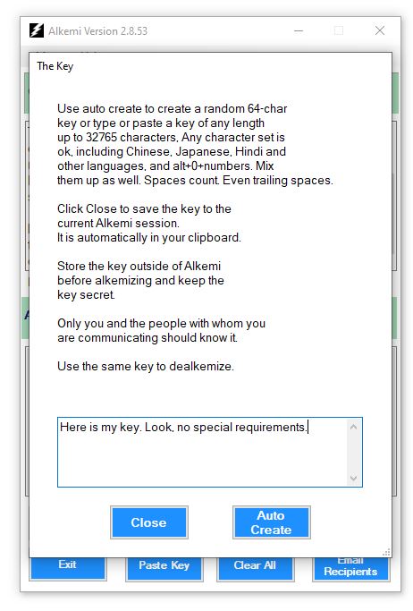 To get back the original message, just paste the Alkemized message you received into the Alkemized Text box, add the key you and your friend share and click the Dealkemize button and voilà! You get the original message back!