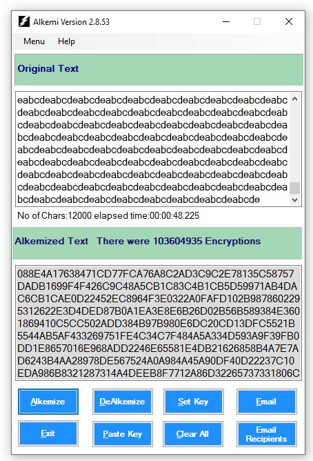 I alkemized a 12000 character Original Text. That took about 48 seconds and went through over 103 million encryption routines.